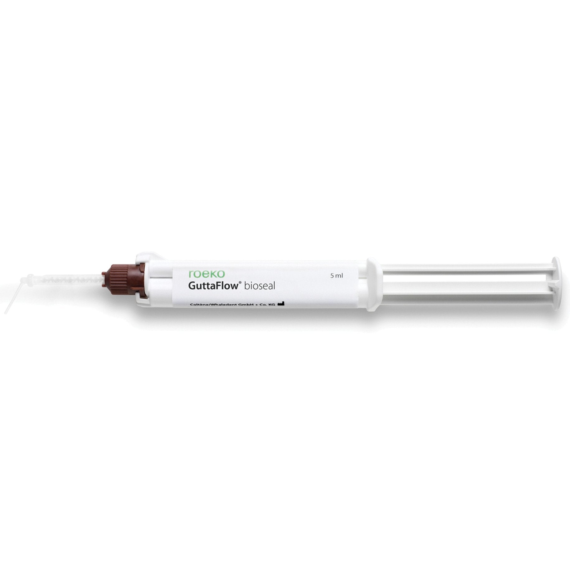 Revised formulation of Guttaflow Bioseal - no longer contains silver. Reliable cold filling system for root canals Gutta-percha and sealer in a single application GuttaFlow 2 is an innovative filling system for root canals that combines two products in one: gutta-percha in powder form with a particle size of less than 30 µm, and sealer. This new filling system works with cold free-flow gutta-percha. Upon contact with fluids, it provides bioactive material such as calcium and silicate and activates biochemical processes. By formation of hydroxylapatite crystals the bioactive material supports adhesion and regeneration of bone and dentin tissue. Benefits:- Combines free-flow gutta-percha with a sealer and bio ceramic at room temperature. Uncomplicated, easy flowing filling material. Tight seal. Working time: 5 minutes; Curing: 12 – 16 minutes. Excellent radiopacity. Allows for excellent post preparation Solubility is virtually zero Optimum protection against re-infection