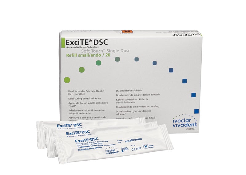 ExciTE F DSC – Dual cure Single Component – is a dual-cure, fluoride releasing adhesive which is used in combination with the total-etch technique. ExciTE F has been further designed for clinical cases where light cannot be used for curing (e.g. in the cementation of endodontic posts or indirect restorations) or in which chemically curing composites are employed. Advantages:- Simple, one-step system due to the patented, initiator-coated applicator brush No light-curing required if a dual or self-curing composite restorative or luting composite is used ExciTE F DSC is based on ExciTE F and thus offers the same proven physical properties Fluoride release Hygienic Single Dose vessels with applicators in two different sizes: Regular for normal preparations, Small/Endo for micro-cavities and root canals Indications:- Adhesive cementation of indirect restorations made of ceramic or composite with dual or self-curing luting composites (e.g. Variolink II) Adhesive cementation of root posts (e.g. FRC Postec Plus) Direct restorations and core build-ups with dual and self-curing composites (e.g. MultiCore) Direct restorations/cementation with light-curing composites (e.g. Tetric EvoCeram, Variolink II Base)