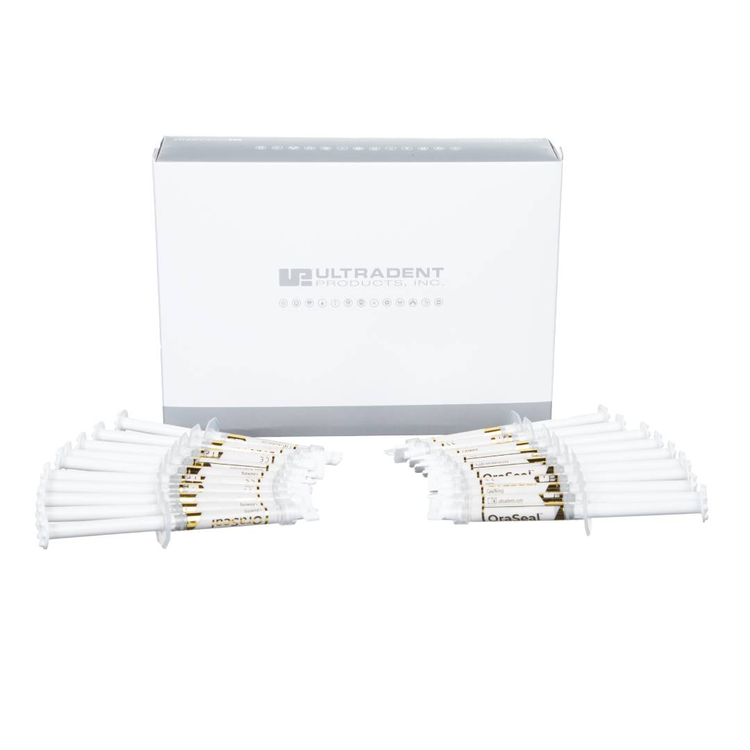 Use OraSeal Caulking material when an adequate seal is difficult to obtain with compromised teeth or roots. It may also be used to repair rubber dam leaks. It seals the rubber dam when performing a porcelain repair, protecting gingiva from hydrofluoric acid. Deliver into undercuts and below implant bars, precision attachments, etc. to prevent cold cure acrylic or impression material from locking into empty spaces. Fill in gingival embrasures of splints and bridges to facilitate easy cleanup of permanent cement. Also used to fill in screw holes on implant impressions prior to making impressions. Adheres under water and saliva Provides a protective seal against gingival exposure to peroxide or hydrofluoric acid Ideal for blocking out unwanted spaces for impressions Effectively adheres to wet rubber dams, tissue, teeth, and metal OraSeal Putty material has a stiffer consistency than the Caulking material, which some doctors prefer Contains: 20 x 1.2ml (1,28 g) caulking syringes
