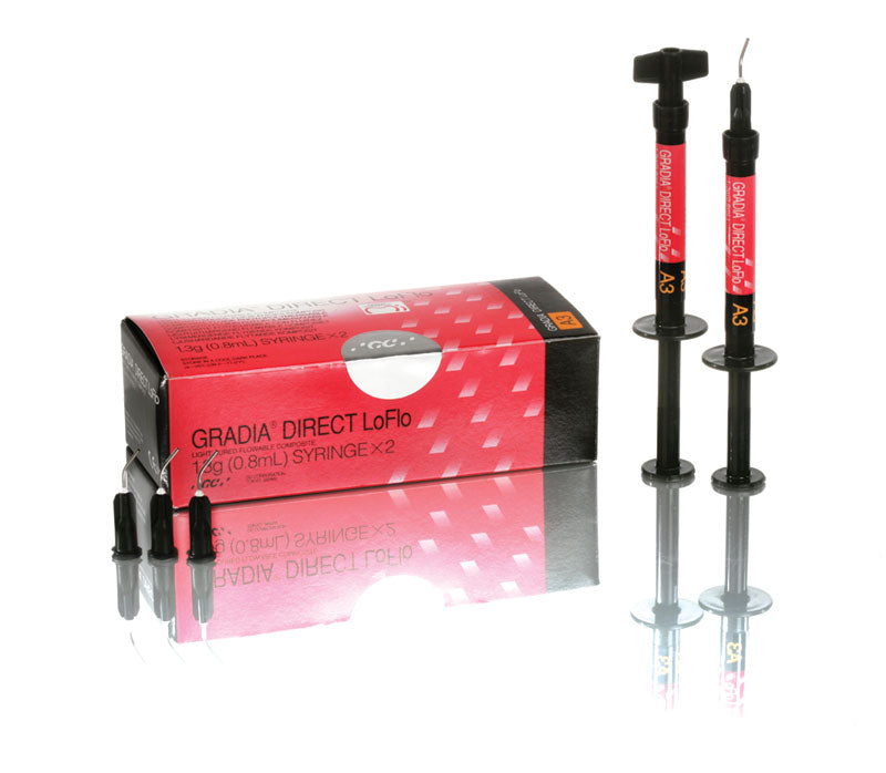 High-viscosity flowable micro-filled hybrid composite with HDR technology. GC Gradia Direct LoFlo is a flowable that can be used not only as liner, but also for direct restorations such as class I and V. Thanks to the presence of HDR (High-Density Radiopaque) fillers, this flowable composite features high physical properties. Indications:- Restoration of Class I, II, III, IV, V cavities Restoration of root surface caries Restorations in deciduous teeth Filling tunnel shaped cavities Sealing hypersensitive areas Advantages:- Superior wear resistance and fracture toughness Wettability allows for perfect adaptability without slumping The 7 available shades blend invisibly into the surrounding tooth structure HDR pre-polymerized fillers with nano-silica filler technology significantly increase durability, polishability and radiopacity Fluoro-alumino-silicate glass brings you protection against secondary decay in addition