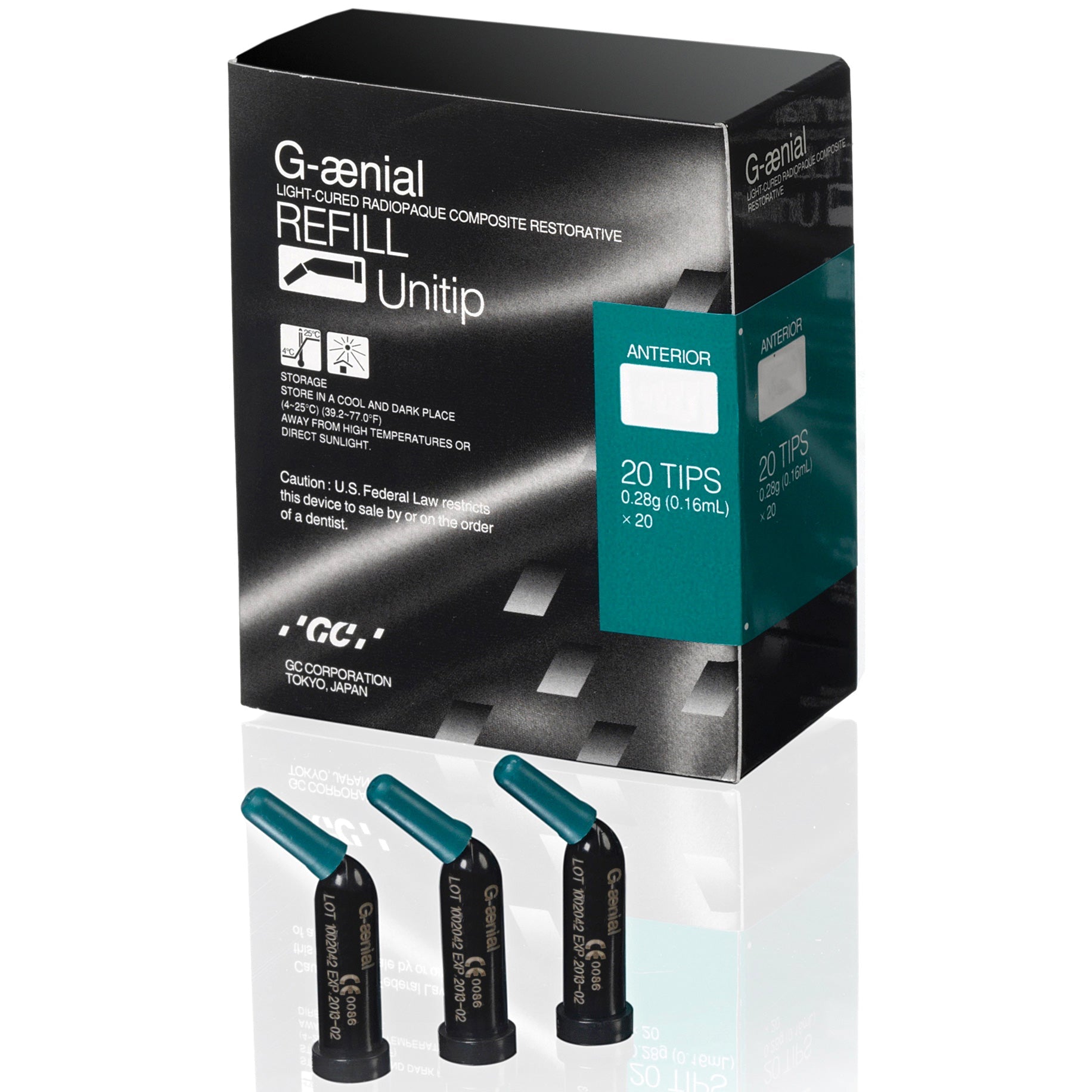 Light-cured radiopaque composite restorative. Indications:- G-aenial features a unique composition which provides an excellent chameleon effect and integration – in most cases with only one shade. To replace enamel, G-aenial features an age-related shade system: Junior Enamel (JE) for young patients Adult Enamel (AE) for adult patients Senior Enamel (SE) for senior patients Advantages:- G-aenial Anterior will reinforce your aesthetic skills and ability to match every restoration with nature. Suited to all application techniques: from mono-shade beauty to a thousand aesthetics possibilities using multi-shade layering Smooth, non-sticky viscosity that can even be handled with a brush Stress-free work in multi-layer restorations: working time of around 4 min. Aesthetic & radiopaque: unique patented High-Density Radiopaque (HDR) filler technology for easy traceability through X-rays G-aenial Posterior is formulated to provide both strength and low shrinkage stress to help reducing the risk of long term failure. Excellent aesthetics with just a single shade Adequate radiopacity of 252% Al facilitates the follow-up Non-sticky packable viscosity for better control contouring and building anatomical forms.