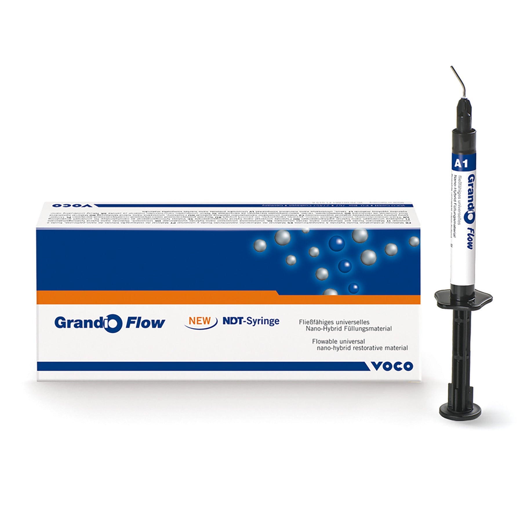 Flowable universal nano-hybrid restorative Indications:- Filling small class I cavities Extended fissure sealing Blocking-out of undercuts Lining, coating of cavities (CBF technique, lining technique) Restorations class II to V Repair of fillings and veneers Luting of translucent prosthetic pieces (e.g. porcelain-only crowns, veneers) Advantages:- Optimal flowability High filler degree of 80.2% w/w Exact shade match to Grandio® Excellent wetting properties Microhybrid composite – like physical properties Significantly lower polymerization shrinkage than conventional flowables Very good abrasion resistance High transverse strength Can be used with all conventional bonding agents The shades BL (Bleach light) and WO (White opaque) fulfil special indications: Bleach light is suited for bleached teeth and for use in paediatric dentistry. The shade White opaque makes an ideal restoration base on e.g. discoloured dentine areas and in core build-up. Grandio® Flow in the new NDT®-syringe:- NDT® means non-dripping-technology Especially for fine-flowing materials Can be dosed and applied precisely Without any loss of material