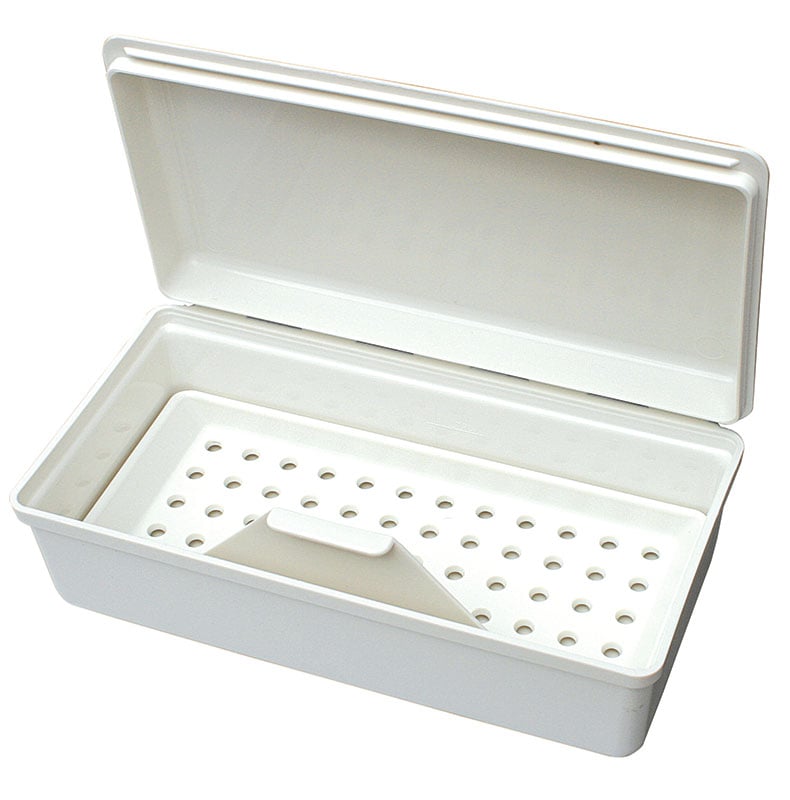 A soaking instrument bath for use with Alkazyme Instrument Cleaner. Complete with drainer and hinged lid, this is a compact, useful means of disinfecting equipment by soaking it in cleaning liquid. This bath's dimensions are 27cm (L) x 15cm(W), with a height of x 9cm which gives it a capacity of 1 litre. The 'drainer' in this bath is a perforated insert tray, which your equipment will rest on while disinfecting. The drainer has a handle which allows you to lift said tray out, and drain all liquid, and retrieve your newly-cleaned equipment. This bath is autoclavable. Features & Benefits: For use with Alkazyme Instrument Cleaner. High-grade autoclavable instrument bath. Product Details: 1x 1L Alkazyme Bath 1 litre capacity, dimensions: 27cm(L) x 15cm(W) x 9cm(H) FAQs: How long should I immerse my instruments in Alkazyme? Alkapharm recommends submerging instruments in Alkazyme Instrument Cleaner for at least five minutes before removal. Is Alkazyme a disinfectant? Alkapharm defines Alkazyme as a "combined cleaner-pre-disinfection agent for use in the reprocessing of all reusable immersible, surgical, medical and dental devices prior to sterilisation"