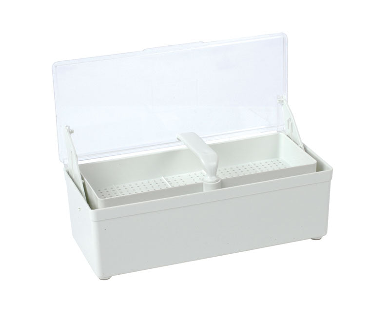 A sterilisation box for instruments, featuring a capacity of 1 litre and dimensions of 260mm by 110mm by 80mm. This bath cannot be autoclaved after or before use. Used for immersing or 'soaking' tools in disinfectant baths of cleaning fluid, it features a hinged lid to prevent contaminants entering the bath, spillages, or splashing, and a mesh draining tray, which you can use to lower or raise your equipment into the cleaning fluid, without risking contact with the bath itself. Features & Benefits: Draining tray and lid for contamination control. Cannot be autoclaved. Product Details: 1 x Steriltray, 1 litre capacity, dimensions 260(L) x 110(W) x 80(H) mm. FAQs: How can I best ensure my tools are cleaned after a soaking bath? Please disassemble your tools before soaking. Some cleaning fluids are cleaner-pre-disinfection agents, and your tools may require further cleaning. How can I improve my instrument's lifespan? A short, second rinse using demineralised water is recommended to help prevent rust or degradation.