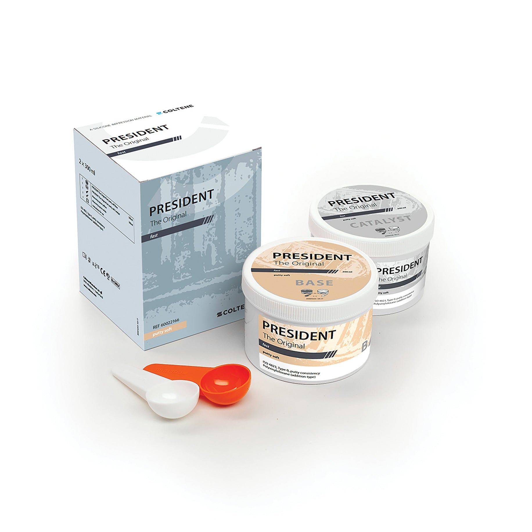 On the occasion of the 40th anniversary of PRESIDENT, the A-Silicone line has been relaunched under the new brand name PRESIDENT The Original with improved characteristics. New colours The new, fresh colours of the PRESIDENT line provide a better contrast between wash and tray material and thus show more accurate detail readability. New materials The tray portfolio of new PRESIDENT contains beside the common materials two additional viscosities: MonoBody and Putty Super Soft. With the line extension of the monophase material MonoBody, implant impressions can be done even more precisely. In addition, the new Putty Super Soft is very smooth and easy to mix. The new wash material portfolio of PRESIDENT offers beside light body and regular body one additional viscosity: Xtra light body As indicated by the name, Xtra light body is a very fluid wash material which can be used to capture even marginal details as it flows into the narrowest areas without dripping from the tooth. PRESIDENT The Original Fast Putty Soft:- Putty is the preferred material for the 2-step technique where pressure is needed. Besides the well-known putty soft the new putty super soft is very smooth and easy to mix. Different end hardness’s offer optimal stability and simple ease of cutting.