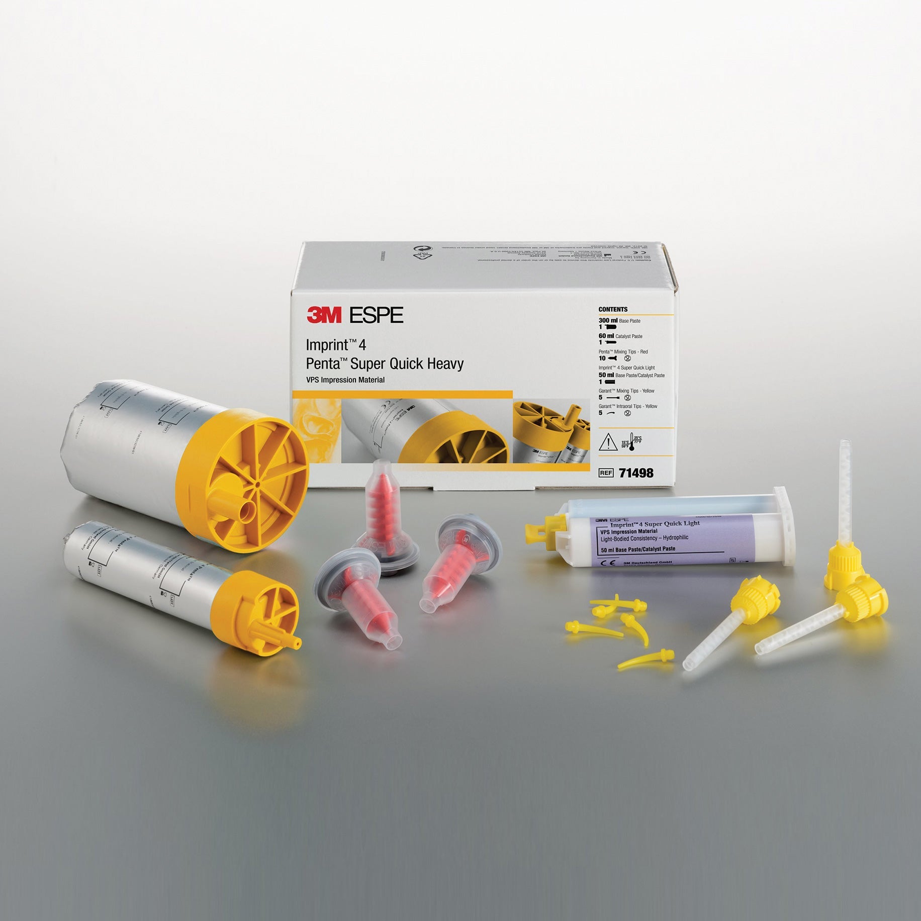 The innovative A-silicone precision impression material offers extraordinarily precise impression results and an extremely short intra-oral setting time. For 1-step tray/wash or 2-step putty/wash technique. All tray materials incl. Putty for automatic mixing and dispensing in the Pentamix system (Pentamix 2 and 3). Very short intra-oral setting time thanks to active self-warming Sufficient working time for a stress-free procedure Hydrophilic properties for excellent flow and fine detail reproduction with a pleasant minty flavour. Fresh material colours for enhanced readability Pleasant minty taste for more patient comfort Indications Imprint 4 VPS Impression Material is especially designed for all kinds of precision impressions using the 1-step and 2-step impression techniques: crown and bridge inlay and onlay implant orthodontic impressions Contains 1 x 300ml base paste, 1 x 60ml catalyst, 1 x 50ml wash cartridge, 10 Penta Mixing Tips red, 5 Garant Mixing Tips yellow, 5 intra-oral tips yellow. 71498