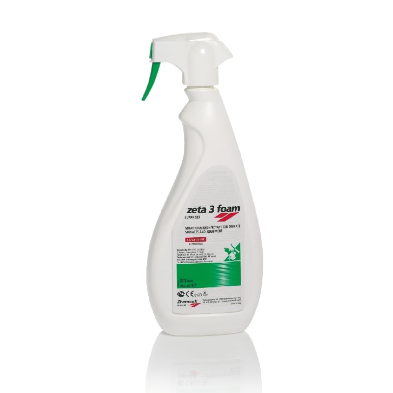 Aldehyde-free, broad spectrum, ready-to-use disinfectant detergent. Lemon fragrance. Applications:- Because of its excellent compatibility with all materials, Zeta 3 Foam is especially recommended for disinfecting delicate surfaces Zeta 3 Foam is specially formulated for rapid, high-level disinfection of surfaces and medical devices (handpieces, shelves, dental units, contra-angles, instrument trays, film holders, light handles, dental units' basins, etc.) between one patient and the next Use:- Spray Zeta 3 Foam over all the surfaces and medical devices to be disinfected. Leave the foam for at least 1 minute, then clean the surfaces/devices with a tissue and dry them off Alternatively, you can spray Zeta 3 Foam on to a tissue and wipe over the surfaces or devices to be disinfected Spectrum:- Bactericidal: EN 13727, EN 14561 (S. aureus, P. aeruginosa, E. hirae) Fungicidal: EN 13624, EN 14562 (C. albicans, A. niger) Tuberculicidal: EN 14348, EN 14563 (M. terrae) Virucidal including HIV, HBV, HCV: EN 14476 (Poliovirus,Adenovirus, Parvovirus)