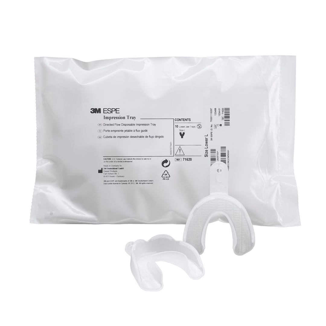 Directed Flow Disposable Impression Tray - For preliminary and final impressions. Ready-to-use 3M™ ESPE™ Impression Trays have an integrated self-retentive fleece strip which reliably keeps the impression material in the tray. The application of a tray adhesive is not needed – saving valuable preparation time. Available in three optimized sizes – for both upper and lower jaw – 3M ESPE Impression Trays are designed to fit virtually every adult patient. Their directed-flow design minimizes flow defects and distal voids to improve impression accuracy and reduce the need for remakes 3M ESPE Impression Trays can be easily customized which also makes them ideally suited for implant impressions. They allow for accurate impressions of the soft/hard tissue as well as of the implant system’s transfer copings. Hygienic 3M ESPE Impression Trays are disposable, single-use trays. A built-in reservoir and a surrounding retention lip prevent material overflow to help reduce gagging 71615