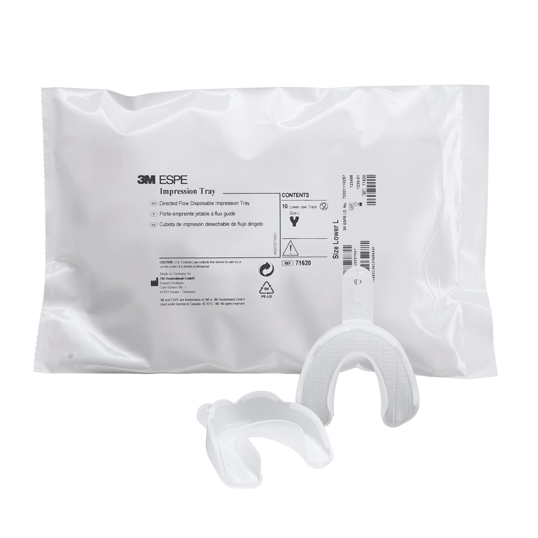 Directed Flow Disposable Impression Tray - For preliminary and final impressions. Ready-to-use 3M™ ESPE™ Impression Trays have an integrated self-retentive fleece strip which reliably keeps the impression material in the tray. The application of a tray adhesive is not needed – saving valuable preparation time. Available in three optimized sizes – for both upper and lower jaw – 3M ESPE Impression Trays are designed to fit virtually every adult patient. Their directed-flow design minimizes flow defects and distal voids to improve impression accuracy and reduce the need for remakes 3M ESPE Impression Trays can be easily customized which also makes them ideally suited for implant impressions. They allow for accurate impressions of the soft/hard tissue as well as of the implant system’s transfer copings. Hygienic 3M ESPE Impression Trays are disposable, single-use trays. A built-in reservoir and a surrounding retention lip prevent material overflow to help reduce gagging 71617