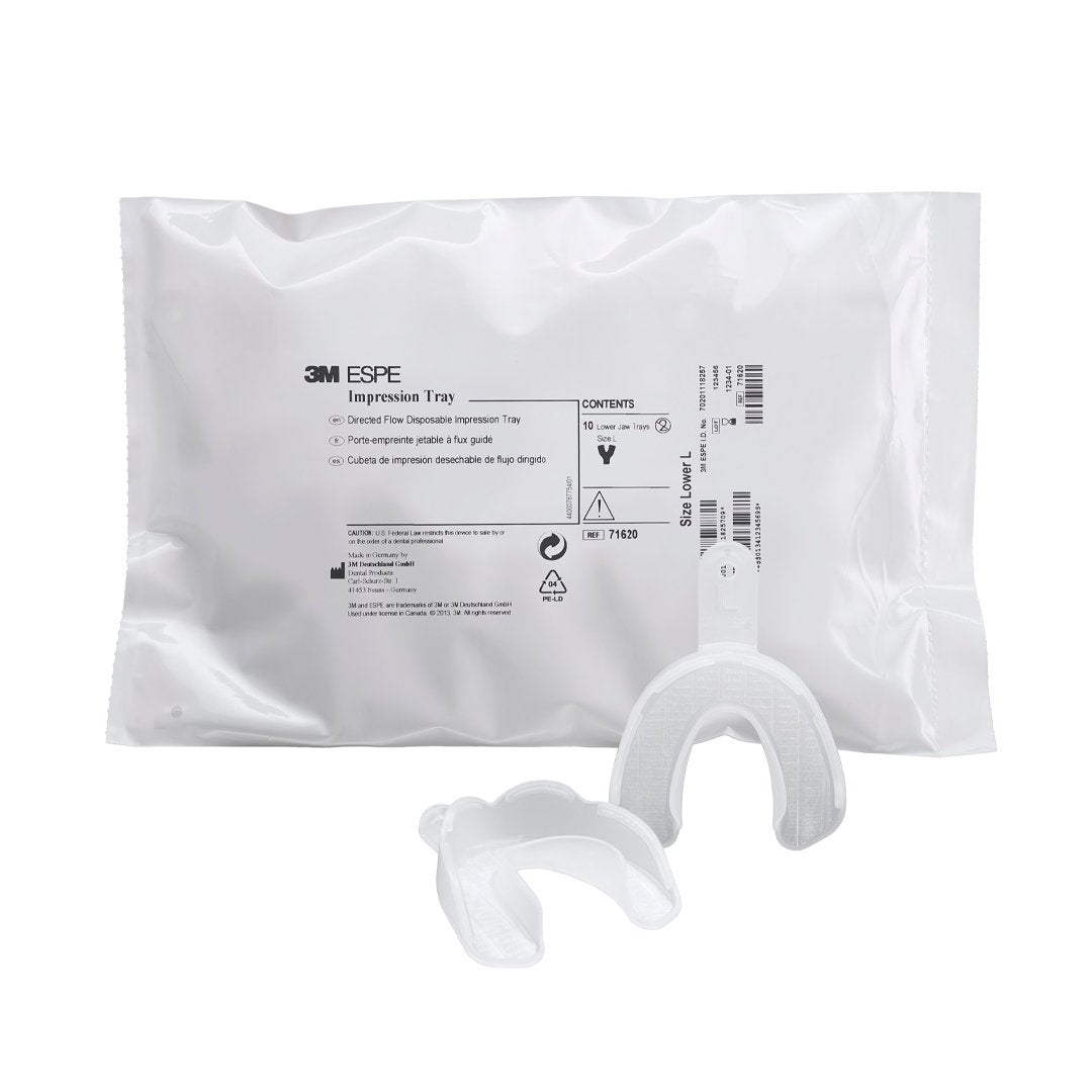 Directed Flow Disposable Impression Tray - For preliminary and final impressions. Ready-to-use 3M™ ESPE™ Impression Trays have an integrated self-retentive fleece strip which reliably keeps the impression material in the tray. The application of a tray adhesive is not needed – saving valuable preparation time. Available in three optimized sizes – for both upper and lower jaw – 3M ESPE Impression Trays are designed to fit virtually every adult patient. Their directed-flow design minimizes flow defects and distal voids to improve impression accuracy and reduce the need for remakes 3M ESPE Impression Trays can be easily customized which also makes them ideally suited for implant impressions. They allow for accurate impressions of the soft/hard tissue as well as of the implant system’s transfer copings. Hygienic 3M ESPE Impression Trays are disposable, single-use trays. A built-in reservoir and a surrounding retention lip prevent material overflow to help reduce gagging 71618