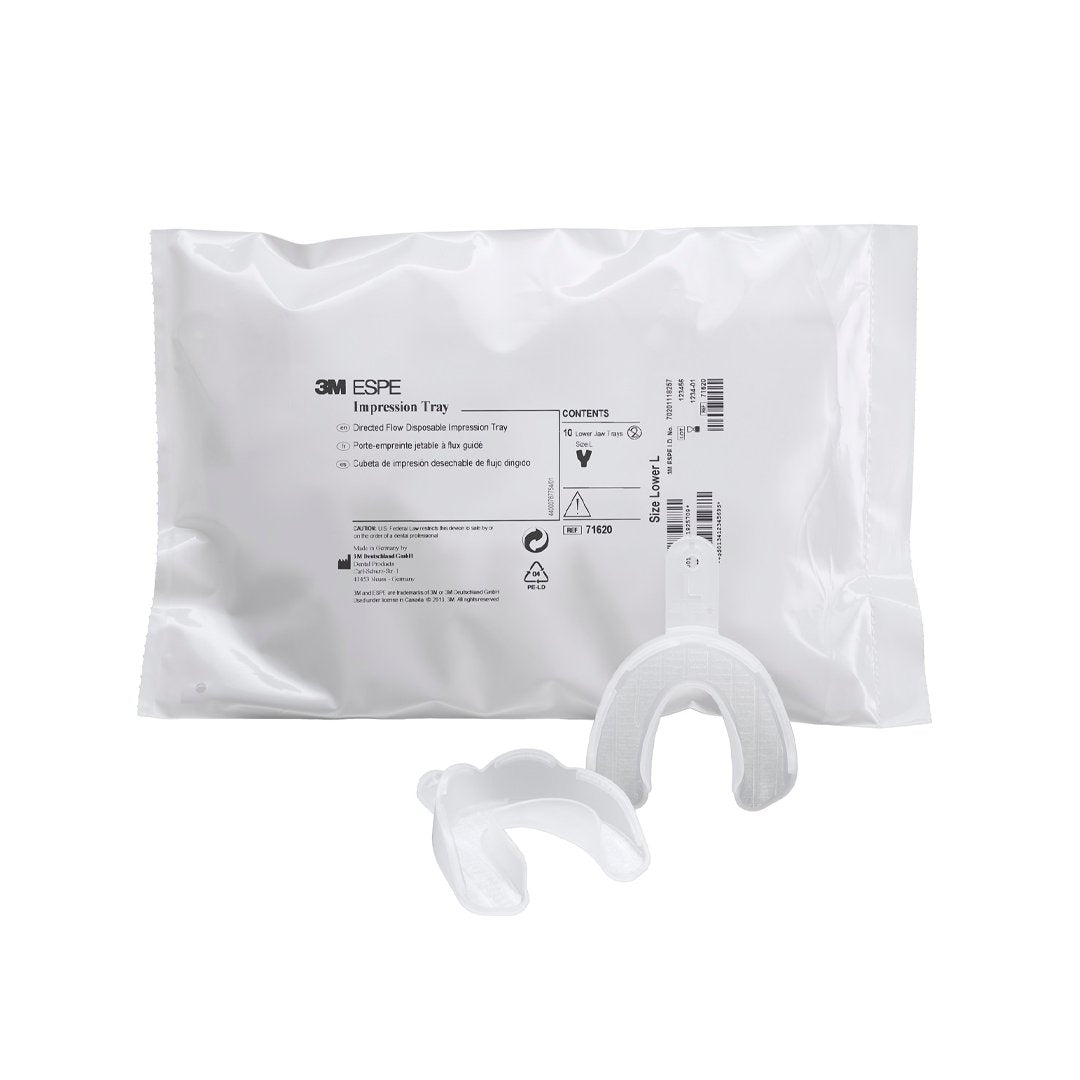 Directed Flow Disposable Impression Tray - For preliminary and final impressions. Ready-to-use 3M™ ESPE™ Impression Trays have an integrated self-retentive fleece strip which reliably keeps the impression material in the tray. The application of a tray adhesive is not needed – saving valuable preparation time. Available in three optimized sizes – for both upper and lower jaw – 3M ESPE Impression Trays are designed to fit virtually every adult patient. Their directed-flow design minimizes flow defects and distal voids to improve impression accuracy and reduce the need for remakes 3M ESPE Impression Trays can be easily customized which also makes them ideally suited for implant impressions. They allow for accurate impressions of the soft/hard tissue as well as of the implant system’s transfer copings. Hygienic 3M ESPE Impression Trays are disposable, single-use trays. A built-in reservoir and a surrounding retention lip prevent material overflow to help reduce gagging 71619