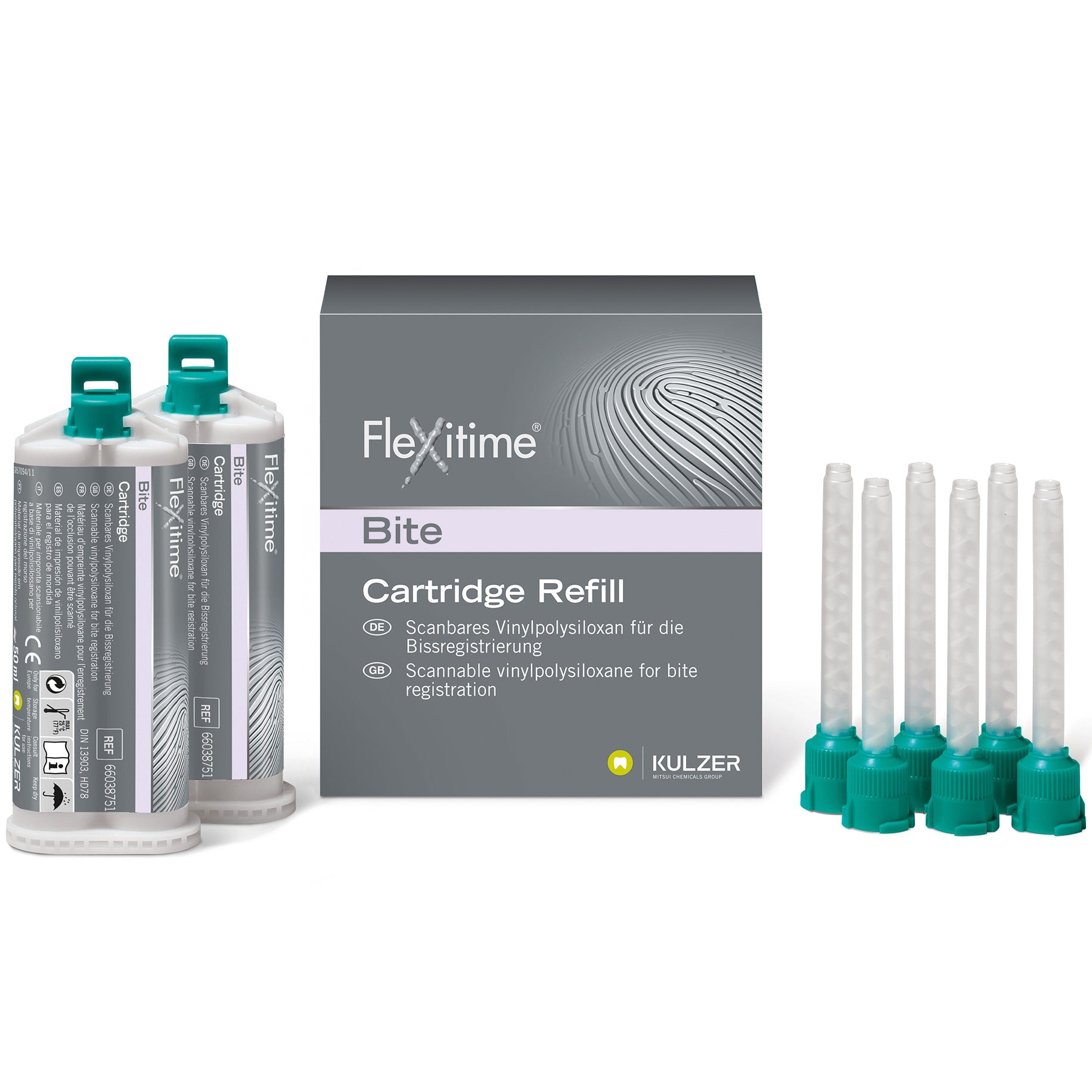 Flexitime Bite is a scannable bite registration material that is suitable for both universal bite registration and also for powder-free optical data recording of the antagonists for CAD/CAM technology, e.g. for fabrication of all-ceramic restorations. Flexitime Bite offers convincing material properties:- Flexitime Bite is extra-hard and precise. Very high final hardness of Shore D 40 prevents undesirable shifts when adjusting the position of the casts in the articulator. Distinct thixotrophy avoids flowing off from the occlusal surface into the interdental spaces, and enables easy removal from the mouth. It shows a superb scannability for the powder-free 3D data recording of antagonists for CAD/CAM technology. Flexitime Bite is very convenient to process:- Flexitime Bite is extremely fast and features a convenient working time of only 30 seconds plus a fast intraoral setting time of only 30 seconds for an increased patient comfort. The set material is easy to trim and grind with minimum risk of fracture. Its whipped-cream-like consistency assures a resistance-free bite. Uses:- Standard bite registration in the final occlusal position, Coating of bite forks Key material for needle point registration Production of small model segments Powder-free optical 3D data recording of antagonists for CAD/CAM technology Contains: 2 x 50ml Flexitime Bite, 12 Mixing Tips green 1:1.