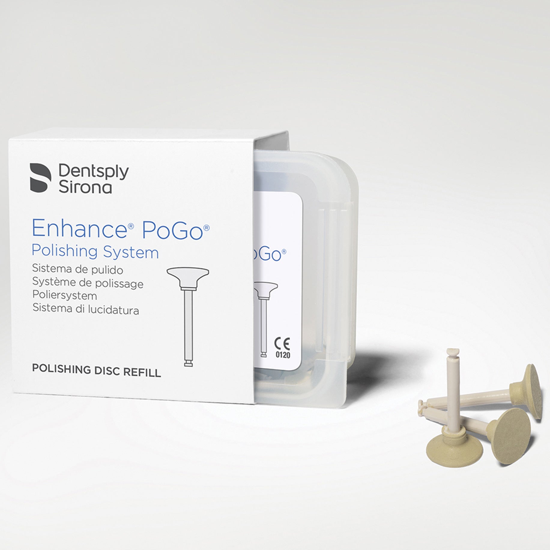 With the Enhance Finishing System, you’ll find an easy, dependable and controllable method for achieving natural looking, high-gloss restorations. Surface roughness testing proves that the composite surface is smoother when Enhance Finishers are used after gross contouring with a bur. As pressure is applied, abrasive particles disengage from the Enhance cup, disc, or point to effectively buff the surface of the restoration. The result is a smooth, contoured surface that is pre-polished and thus more resistant to plaque retention and staining. Enhance Finishers are available in 3 shapes to handle a variety of clinical applications:- Enhance Finishing Cups are ideal for cervical and proximal line angle areas as well as molar cusps Enhance Finishing Points are ideal for posterior occlusal and concave lingual surfaces Enhance Finishing Discs are ideal for facial surfaces and incisal edge contouring The Enhance Polishing cups are foam, polishing devices used to buff and polish the restoration. Enhance PoGo Polishers are pre-mounted, single-use diamond impregnated cured urethane dimethacrylate resin polishing devices designed for use in the final polishing of all accessible composite resin and compomer restorations. For optimal surface polish, follow the use of Enhance & Enhance mini Finishers with Enhance PoGo Polishers, or Prisma Gloss Composite Polishing Pastes.