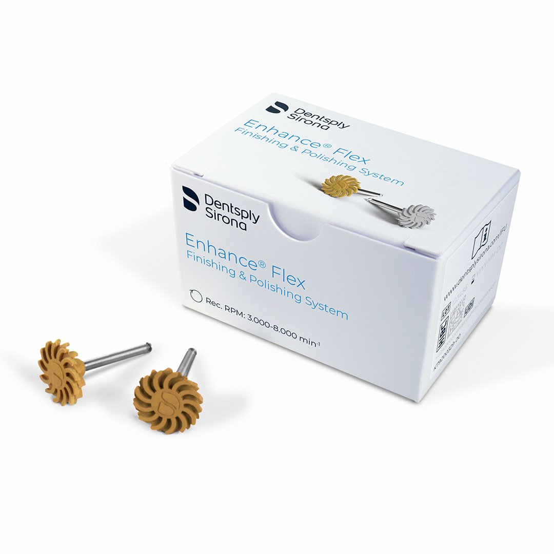 Enhance Flex Finishing & Polishing System The Enhance Flex system features flexible lamellas that adapt to every dental surface structure: anterior and posterior. So you need only one shape for all your composite restorations. It’s that simple. Brilliant polishing results and intuitive application deliver additional advantages. And because it is re-processable up to 10 times, you'll also save on waste and costs. One shape forevery dental surface: The special lamella geometry with rounded edges adapts to virtually any dental surface structure. Extraordinary durability: Save time and money with a system that is re-processable up to 10 times All-around performance: Enhance Flex is suitable for all composite materials and is designed to preserve the tooth structure Brilliant polishing results: Patients will enjoy enviable esthetics, while dentists will appreciate the intuitive application to get there. The Enhance Flex system: Flexible lamellas that adapt to every dental surface structure: anterior and posterior Only one shape for all composite restorations Brilliant polishing results and intuitive application Re-processable up to 10 times, saving on waste and costs Contains: 6 x Finishers Usage: 60 applications