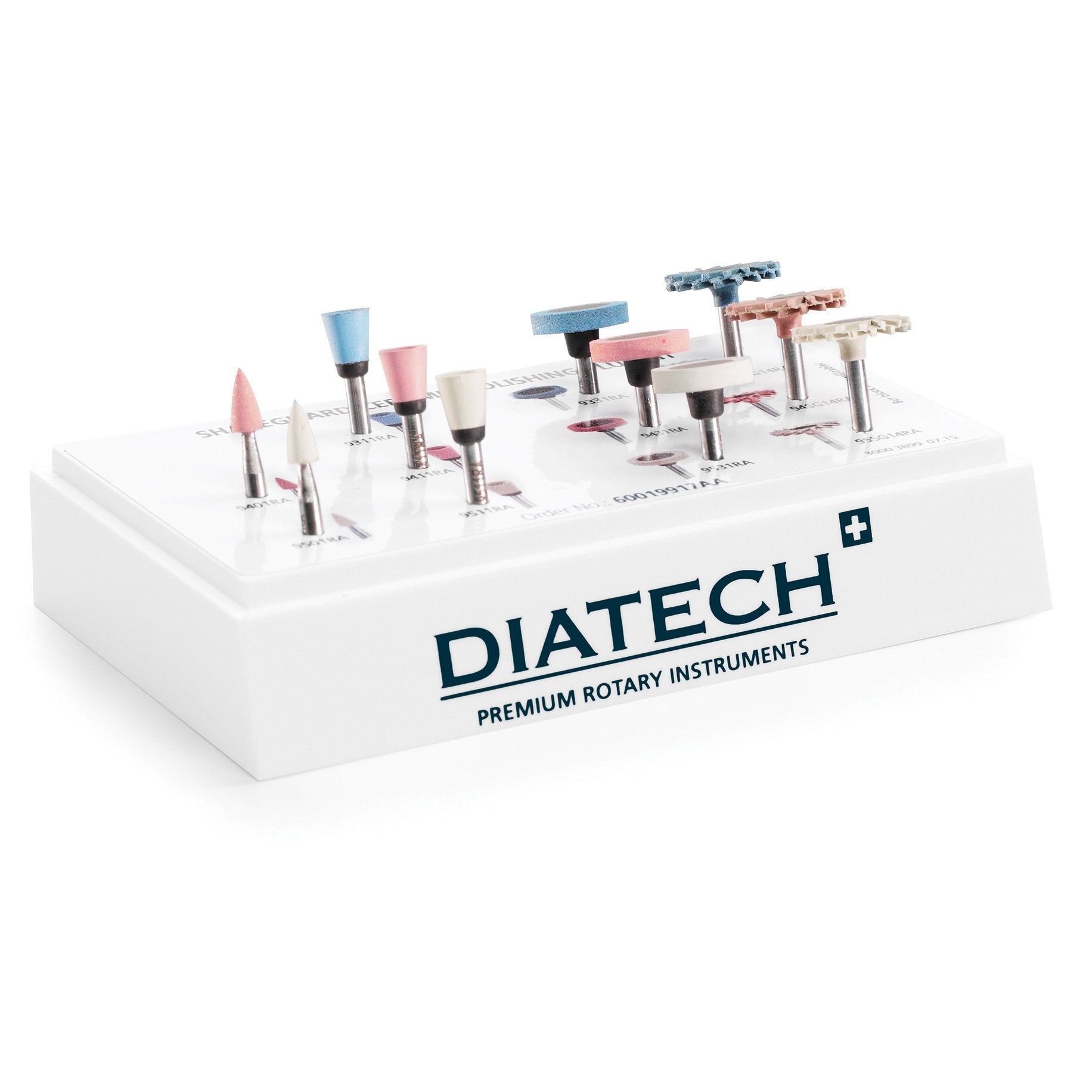 Diatech ShapeGuard is a special head shape developed to facilitate intraoral polishing of almost all areas of composite, ceramic and zirconia restorations. Due to its flexible lamellas, it adapts to any surface and provides uniform pressure distribution so that the morphology of the tooth is preserved. This polisher is fast, easy and intuitive to use and achieves outstanding high luster polishing results. Diatech silicone diamond polishers are recommended to work on materials with a higher final hardness, due to the diamond particles increasing their durability and abrasiveness. The softer silicone polishers are best suited to work on materials with a lower hardness, without reducing the structures which give a tooth its natural look. ShapeGuard Ceramic Polishing Plus Kit:- This kit offers a comprehensive selection of silicone polishers for finishing (blue polishers), prepolishing (red polishers) and high luster polishing (grey polishers) of ceramic restorations. While minipoints are used to smoothen and polish interproximal and hard to reach occlusal areas, the cups are especially indicated for cusp polishing, but also occlusal polishing in general. The wheel is recommended to precisely polish smaller occlusal areas such as contact points. Contains 1 x Silicone Polisher 9311RA, 1 x Silicone Polisher 9331RA, 1 x ShapeGuard silicone polisher 93SG14RA, 1 x Silicone polisher 9401RA, 1 x Silicone polisher 9411RA, 1 x Silicone polisher 9431RA, 1 x ShapeGuard silicone polisher 94SG14RA, 1 x Silicone polisher 9501RA, 1 x Silicone polisher 9511RA, 1 x Silicone polisher 9531RA, 1 x ShapeGuard silicone polisher 95SG14RA
