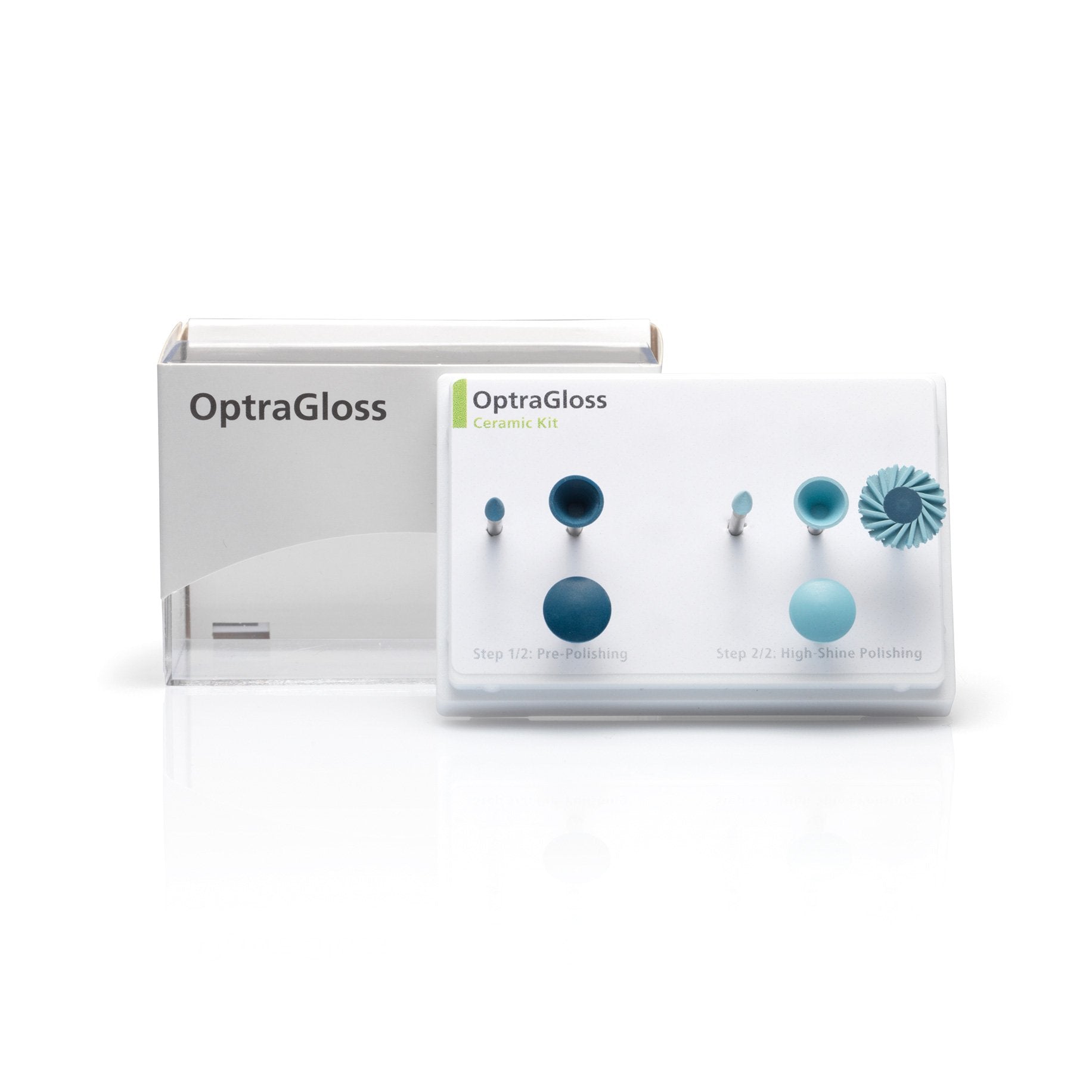 One polishing system for all popular indications in the dental practice OptraGloss is a universal polishing system for extraoral and intraoral use. It is suitable for the high-gloss polishing dental restorationsmade of composite resin and ceramics. OptraGloss consists of a dark-blue diamond polisher for pre-polishing and a light-blue diamond polisher forhigh-gloss polishing. For the one-step polishing of composite resin fillings, only the high-gloss polisher is required. The polishers areavailable in the shapes “Cupâ€, “Flameâ€, “Lens†and now also “Spiral Wheel†(only as high-gloss polisher). Advantages- Particularly smooth and shiny restoration surfaces No additional polishing paste needed Two-step high-gloss polishing of ceramic restorations One system for all popular indications in the dental practice Indications- Polishing of composite resin fillings Polishing of restorations made of glass-ceramics, feldspathic ceramics and oxide ceramics Ceramic Kit contains - 1 x Flame VP, 1 x Cup VP, 1 x Lens VP, 1x Flame HP, 1 x Cup HP, 1 x Lens HP & 1 x Spiral Wheel HP. VP = Pre-polisher ( Dark Blue) HP= High-gloss polisher (Light Blue)