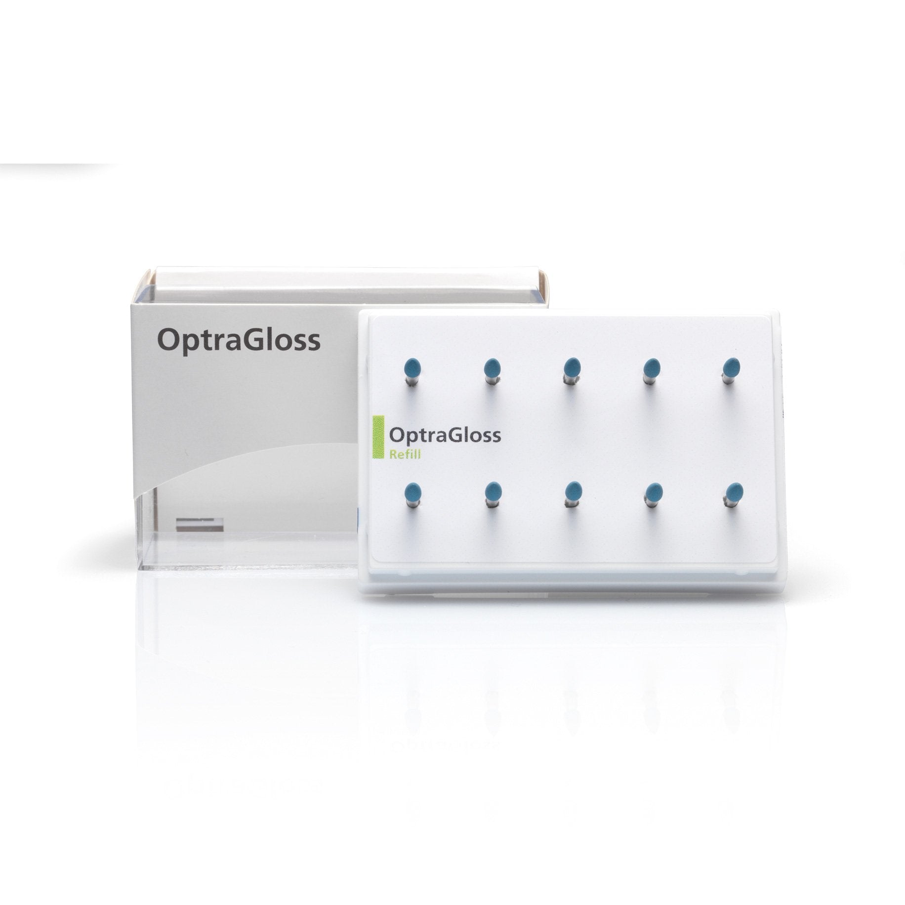 One polishing system for all popular indications in the dental practice OptraGloss is a universal polishing system for extraoral and intraoral use. It is suitable for the high-gloss polishing dental restorationsmade of composite resin and ceramics. OptraGloss consists of a dark-blue diamond polisher for pre-polishing and a light-blue diamond polisher forhigh-gloss polishing. For the one-step polishing of composite resin fillings, only the high-gloss polisher is required. The polishers areavailable in the shapes “Cupâ€, “Flameâ€, “Lens†and now also “Spiral Wheel†(only as high-gloss polisher). Advantages- Particularly smooth and shiny restoration surfaces No additional polishing paste needed Two-step high-gloss polishing of ceramic restorations One system for all popular indications in the dental practice Indications- Polishing of composite resin fillings Polishing of restorations made of glass-ceramics, feldspathic ceramics and oxide ceramics