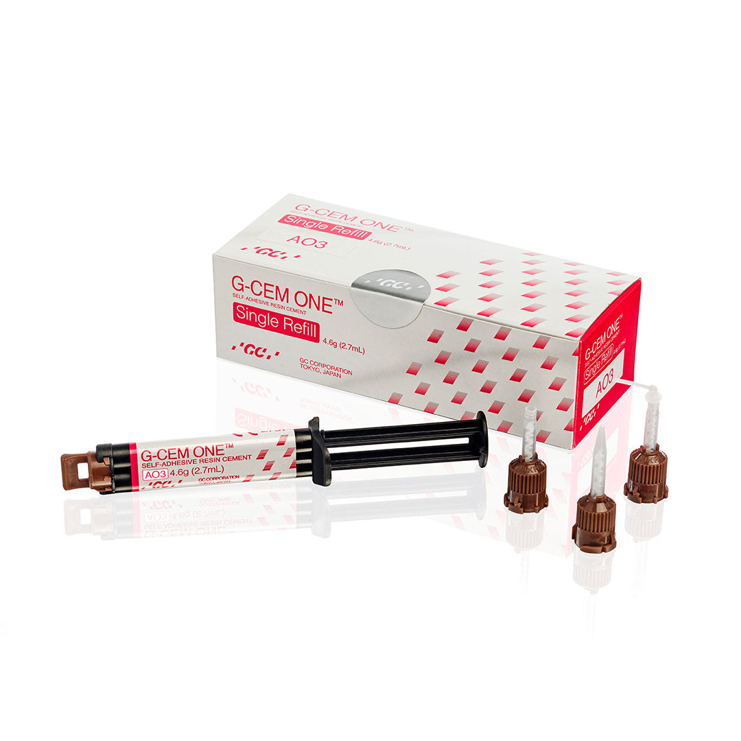 G-CEM ONE, the new self-adhesive resin cement from GC simplifies all cementation procedures. G-CEM ONE brings together high bond strength, effortless clean-up and long-lasting esthetics as well as an excellent self-curing ability for a wide range of indications in ONE product solution. G-CEM ONE is a truly universal, non-technique sensitive, versatile and reliable product that gives the flexibility of being effective in all cementation procedures for any type of restorations; from metal-based to resin and all-ceramic inlays, onlays, crowns, bridges, and posts. It demonstrates excellent bond strength to enamel, dentin and all indirect restorations. In addition, the optional Adhesive Enhancing Primer (AEP) and its innovative GC Touch Cure feature provides optimal bond strength in challenging clinical situations, such as low retentive surfaces. The chemical initiator in the AEP accelerates the chemical cure of the cement to ensure optimal bonding. The AEP is easy to apply; no additional light-curing is needed – apply and air-dry. G-CEM ONE offers clinicians a reduced inventory with less components for a reproducible workflow. It’s simply the ONE for peace of mind when it comes to clinicians' adhesive requirements. Indications:- Cementation of all types of all ceramic, resin and metal-based inlays, onlays, crowns and bridges. Cementation of metal, ceramic, fiber posts, and cast post and cores. Cementation of all ceramic and composite veneers. Final cementation of crowns and bridges on implant abutments. Contains: 1 x G-CEM ONE Syr. A03 (4,6g) 8 x GC Automix Tips Regular 2 x GC Automix Tip for endo with extension tips