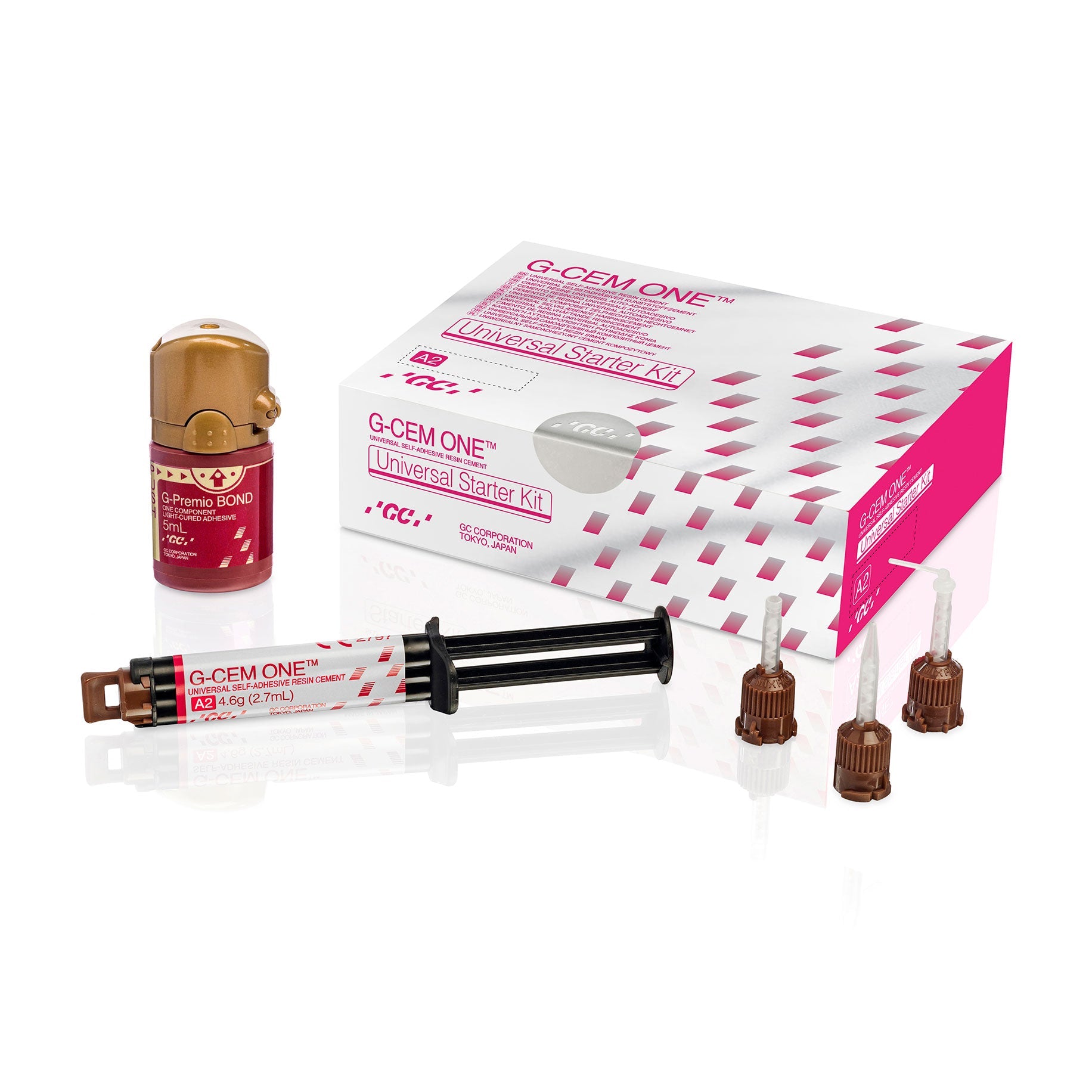 Universal self-adhesive resin cement G-CEM ONE is a truly universal self-adhesive resin cement for all indications and all types of restorations. Depending on the preparation, you could choose from either a simplified self-adhesive cementation or full adhesive application. G-CEM ONE can be optionally combined with the innovative G-CEM ONE Adhesive Enhancing Primer (AEP) whenever maximum bond strength is needed. GC also recommends the option to combine G-CEM ONE with the universal bonding agent G-Premio BOND. Whether you want to benefit from the touch cure feature with no light-curing step of the G-CEM ONE AEP; or you prefer the multiple indication and light-curing option of G-Premio BOND, there is always a perfectly adapted solution. Features & Benefits:- Invisible margins for aesthetic outcome: Wear-resistant margins Long-term, color-stable aesthetic results Touch Cure without light thanks to G-CEM ONE Adhesive Enhancing Primer (AEP): Very effective dark-cure (self-cure) reaction Safe and fast setting in any clinical situation, especially where light access is limited Simple procedure: just apply the G-CEM ONE AEP, wait 10 sec and dry - no light curing needed Simplified Universal Bonding thanks to G-Premio BOND: Featuring three functional adhesive monomers for optimal bond strength, only one bonding agent is needed for all your direct and indirect workflows Award winning bottle design for a very precise application Simple procedure: Apply G-Premio BOND, wait 10 sec, air-dry, light-cure for 10 sec. Any etching technique (self-etch, selective-etch, total-etch) is possible Kit contains 1x G-CEM ONE Syr. TR (4,6g), 8x GC Automix Tips Regular, 2x GC Automix Endo Tips, 1x G-Premio BOND 5mL