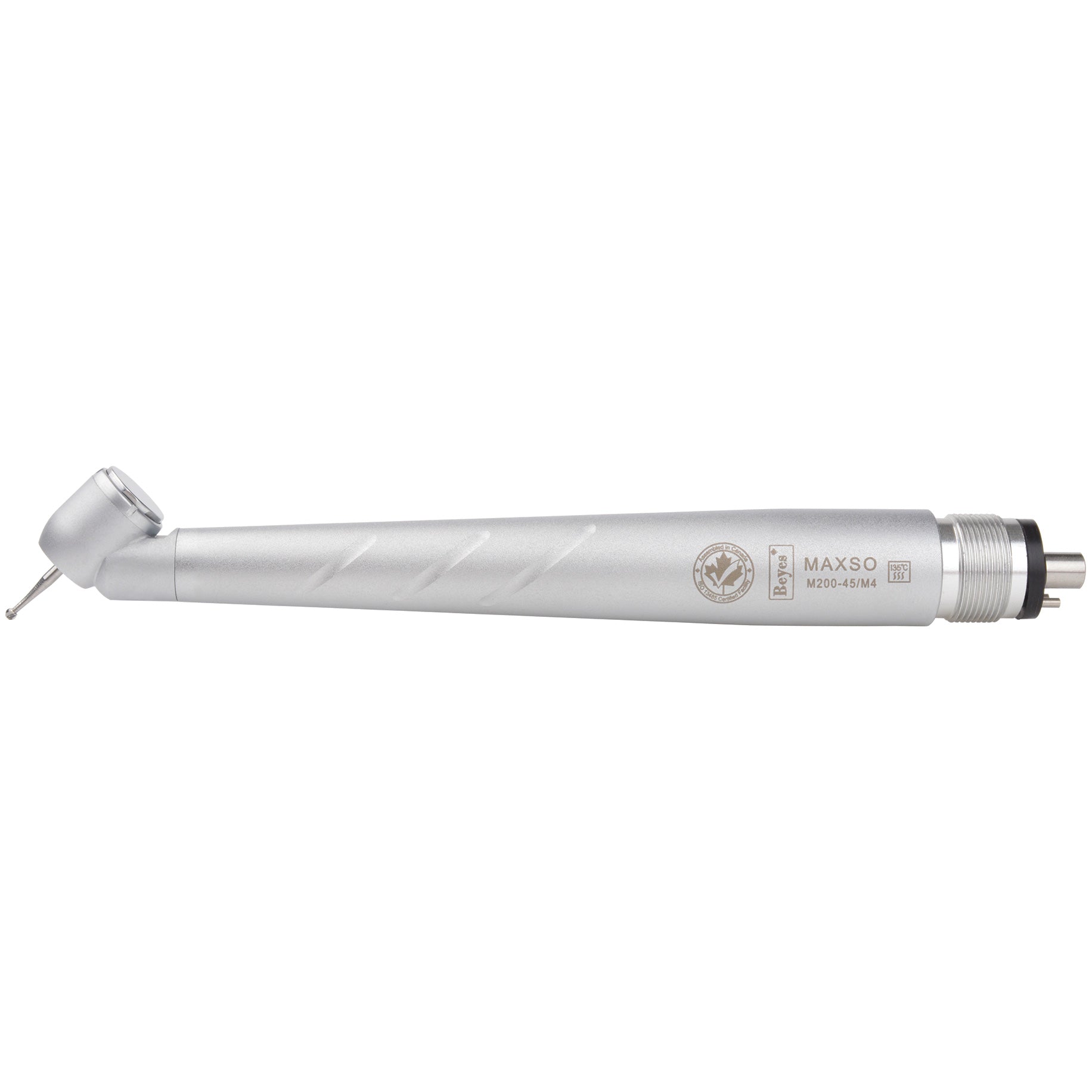 Model: M200-45/M4 Connection: Midwest 4 Hole Description: 45° Head, Rear Exhaust, Stream Water, Non-optic The Maxso 200 Surgical 45 provides excellent accessibility and visibility to make stress-free treatment a reality. It features 20W of cutting power for faster preparation and a rear exhaust to help increase patient safety. With its uniquely angled head, enhanced access is simple. Experience for yourself the difference between ordinary and extraordinary Power - Strong chuck holding force to prevent slippage and improve power with 20W of torque Visibilitym - Stream water (not mist) for perfect bur cooling and visibility Hygiene - Rear air exhaust prevents contamination into cutting area Accessibility - 45° head design for perfect access to the molars Key Specification:- Head Size (Width x Height): 10.8mm x 13.0mm Head Angle: 45° Drive Air Pressure (PSI): 40-60 Power (WATT): 20 Speed (RPM): 400,000 Ø / max. length (MM): 1.6 / 25 Chuck Type: Push Button Water Spray:Single Rotary Instruments: FG burs according to EN ISO 1797-1:1995