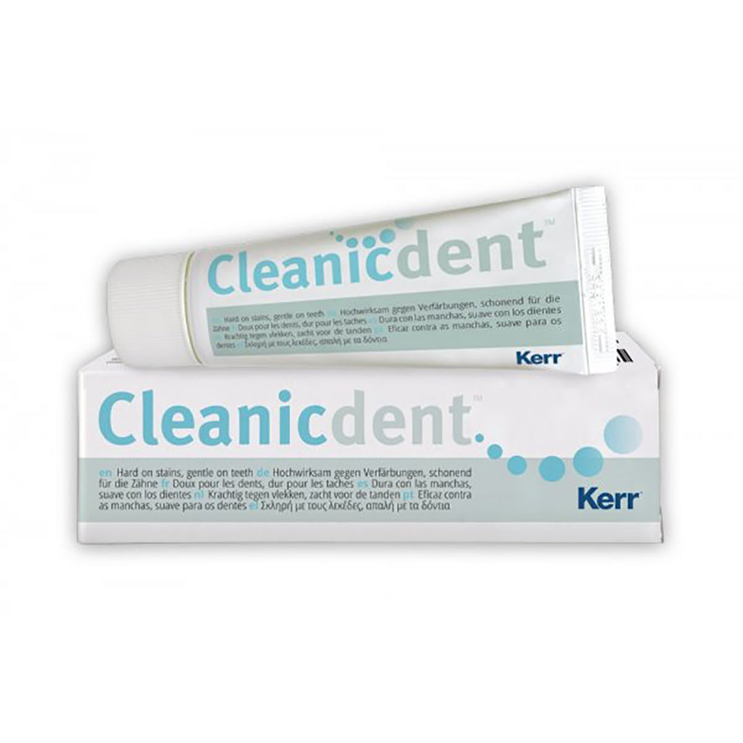 Cleanicdent - Hard on stains, gentle on teeth Cleanicdent is a gentle, effective stain removal toothpaste that boasts its whitening effect thanks to Perlite, the same natural volcanic glass used by the professional prophylaxis paste Kerr Cleanic™. A professional solution that patients can now use at home. Cleanicdent is conceived for patient's use at home to prolongue the whitening of the teeth after a prophylaxis treatment. It can be easily recommended to patients by dentists and hygienists especially by those already using and loyal to Cleanic Prophylaxis Paste. With Cleanicdent, Kerr completes the prophypolishing workflow. What is Cleanicdent Cleanicdent is a toothpaste with whitening effect based on the same technolgogy used in Cleanic, Kerr‘s professional prophylaxis paste. Thanks to Perlite, a cleaning substance which effectively eliminates stains, deposits and dental film Cleanicdent has built-in variable abrasion and ensures cleaning power against stains and non-mineralised deposits, which are mainly caused by the consumption of tobacco, tea, coffee and red wine. During the teeth cleaning process, the pressure exerted on the brush progressively alters the granulometry of this vitreous volcanic substance, transforming it from coarse to fine. In this way, the initial cleaning power transforms into an excellent polishing action with a shine effect, that preserves both the dental enamel and dentine. The development of dental plaque is therefore inhibited How is Cleanicdent used? Cleanicdent with Perlite is used in addition to regular toothpaste. Use Cleanicdent 3-5 times a week for those subject to the rapid formation of exogenous stains on the teeth brushing the teeth thoroughly with Cleanicdent for 2–3 minutes, so that the initial cleaning power switches to polishing power. Features :- Contains no preservatives, no chemical bleaching agent. Contains sodium fluoride (1000 ppm Fluoride). Pleasantly fresh, not too intense mint flavor. Abrasiveness: The Cleanicdent abrasion values correspond to those of regular averagely abrasive toothpaste (RDA 39), but with above average cleaning efficiency.