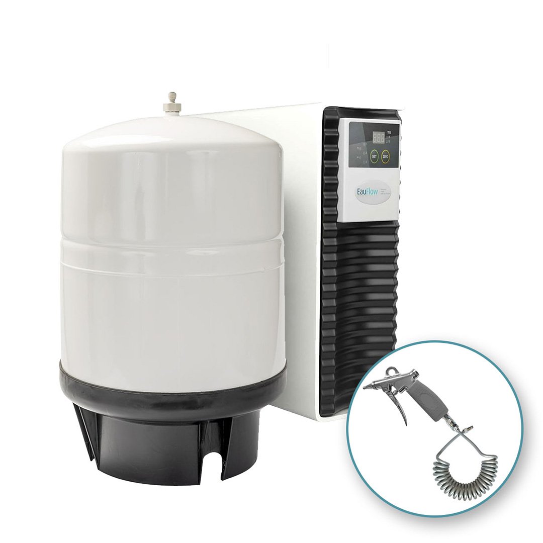 Innovative, simple and cost-effective water purification. EauFlow is a purified water device that utilises Reverse Osmosis (RO) to replace distillers and bottled water. Reverse osmosis is a water purification process that makes use of a partially permeable membrane to remove ions, molecules and particles from the water. EauFlow system includes a multi-level filtration system and an innovative water quality meter that continually checks the water quality and alerts the user to any unacceptable variation. The filters are attached with a bayonet system that is very simple to use, enabling any staff members to insert new filters within seconds to maintain full operating efficiency. EauFlow is considerably less complex, easier to maintain and more reliable than distilling water and saves a significant amount of money and storage space from using bottled water, as well as not creating the plastic waste from the used bottles. When used in conjunction with CleanCert, EauFlow provides a unique, fully comprehensive water purification system that delivers all your practices’ water needs, whilst eradicating inorganic and organic water impurities in minutes. Features: Built-in display shows you both live water quality (Total Dissolved Solids) and alerts you when cartridges need changing. ‘Quick release’ bayonet connections allow clinical staff to carry out tool-free maintenance in seconds Simple proprietary cleaning kit to remove any bacteria simply and quickly Pump and storage tank ensures delivery of consistently pure water for your practice needs, especially when your mains water pressure falls, with a choice of storage tank for your specific needs Simple monitoring of both organic (bacteria) and inorganic water issues Technical spec: Dimensions (L x H x W cm): RO: 40 x 38 x 15. Tank (large 22L): 38cm diameter x 58cm height System pressure: 25- 40 psi Tank pressure: 7psi when empty and detached. 25-40psi when connected Dispensing speed: 1.5 – 2L/min Distance from RO to tap: 3m max, unless additional pump installed Tank refill (average @350ppm): 120-140ml/min Waste water (average @350ppm): 420- 600ml/min The N-EY505-22 package includes: A 5 stage RO water filter with easy maintenance ‘quick release’ cartridges, including ALL connection components, manual and warranty Choice of dispensing valve or trigger nozzle (both included) 10m of plastic tubing (1/4/ 6.2mm) Large 22L water capacity storage tank