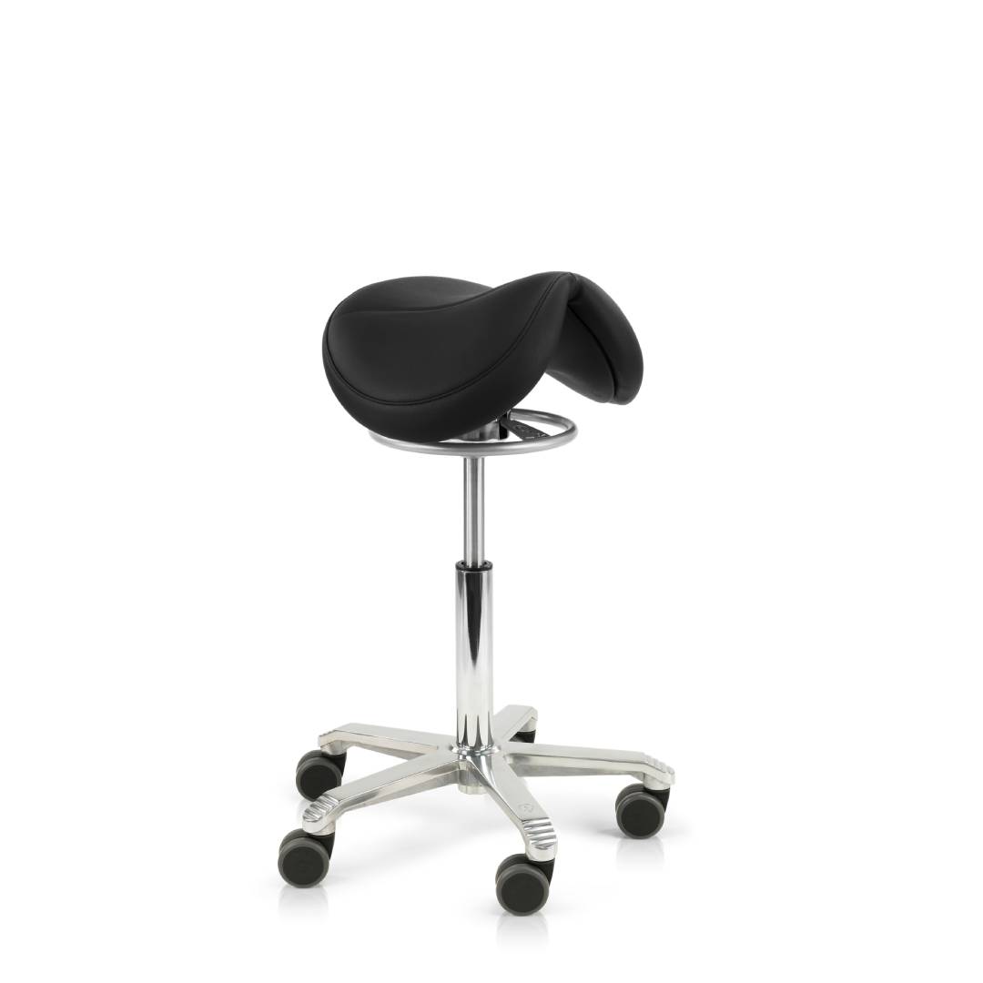 The Score Jumper saddle-shaped seat allows your back to relax naturally as you sit, helping improve breathing, blood circulation, and digestion. Ideal for both desk work and working with patients, the Jumper makes it easy to change positions, sit with less effort, and work longer. Score saddle stools come in two seat shapes: Amazone and Jumper. The Jumper seat is wider (44 cm), often preferred by men or those with a larger frame. For the best effect, raise the stool so you're sitting as high as is comfortable. Features & Benefits: Balance Mechanism: Allows the seat to follow your movements dynamically, supporting you while reducing strain. Encourages micro-movements that benefit core muscles and spine. Adjust resistance using the ring: + (more) or – (less). Adjustable height. Adjustable seat movement resistance. Product Details: Jumper saddle with adjustable balance and seat tilt Standard: Aluminium polished base Ø 540 mm. Soft Ø 65 mm brake-unloaded castors. Max user weight: 120 kg (265 lbs.) Height adjustment (standard gas lift): User height 160–180 cm (5’3”–5’11”) Seat height range: approx. 620–800 mm Shorter gas lift options available—please contact Equipment Sales. Standard range comes in 12 colours (Stamskin). Ultraleather available at a surcharge. Note: Stools are made to order and not available to purchase directly via our website. To discuss your specification, contact our Equipment Sales Department or email EquipmentSales@DDGroup.com