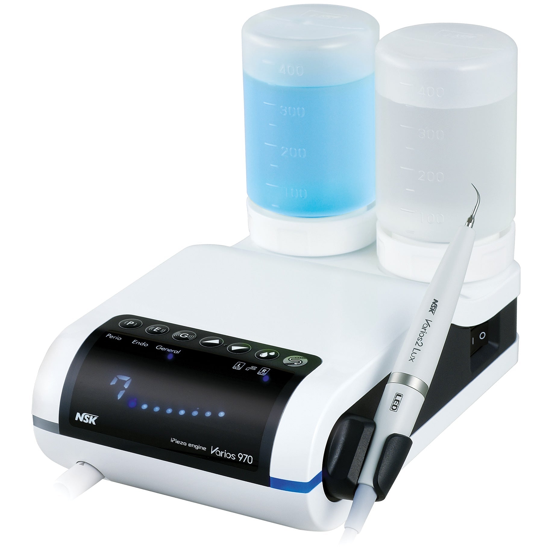Multifunction Portable Unit for Extreme Versatility All-in-one – Stylish compact all-in-one unit for Periodontic, Endodontic, Scaling, MI applications and Implant maintenance. Convenient large capacity bottles of 400ml of the same solution each or different solutions with independent pumps. The all new Varios features the latest developments in piezo technology; The iPiezo engine from NSK assures stable output by automatically adjusting to the optimum frequency depending on the loading of the tip. Features- Large LED display Easily interchangable solution bottles Memory function Simple unit design for clean maintenance Auto cleaning mode Dial function for easy control of water volume 360°Foot Control Specifications- Power supply AC 120V or 230V 50/60 Hz Frequency 28-32 KHz Max. output 11 W (G mode) Dimensions W160 x D270 x H190 (mm) (Including Bottle) Unit weight 2.1 kg (Except attachment) Bottle volume 400 mL (x 2 bottles) Contents- Control unit, Handpiece, Handpiece cord, 3 Scaling tips (G4, G6, G8), Foot control (FC-70), 2 x Irrigation bottles, 3 x Tip wrench with torque limiter, AC power cord, Sterilization case.