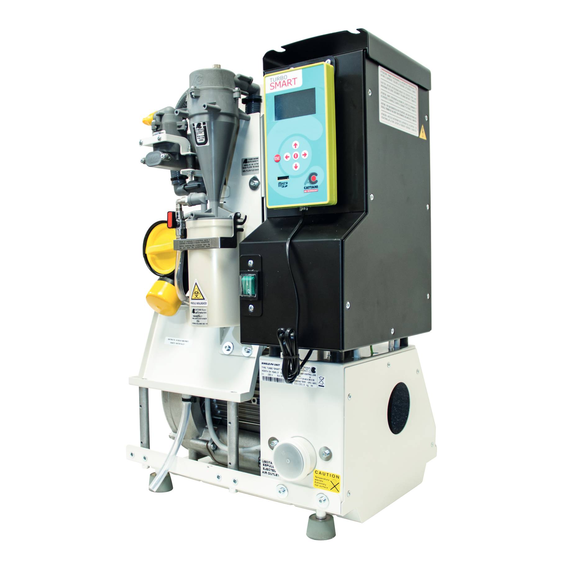 ?Turbo Smart is a powerful, variable speed suction system, ideal for conservation and surgical applications providing high airflow and high vacuum power. It is supplied for two surgery use and is upgradable to four surgeries if required. It has a programmable vacuum level which automatically alters vacuum on demand and responds to any change in use from the surgeries. Turbo Smart also features Cattani’s multi-function digital display which informs the user of the vacuum level, temperature, servicing requirements, amalgam separation, fault diagnosis and programming. 98% separation rate tested by TuV - Essen, Germany. Sound proof cabinet is available which can reduce noise levels to an impressive 51.6 dB (A). Turbo Smart can connect wirelessly enabling professionals to check and adjust suction without leaving the surgery. Turbo Smart is supplied with a 3 year warranty* (subject to Terms and Conditions of servicing schedule). 2 surgeries Output power: 1.22kW-7A Max flow: 1400 l/min Max vacuum level: 210mbar (continuous service) Noise level: 68.2dB(A) Dimensions: W400 D335 H650 (mm) Net weight: 36kg