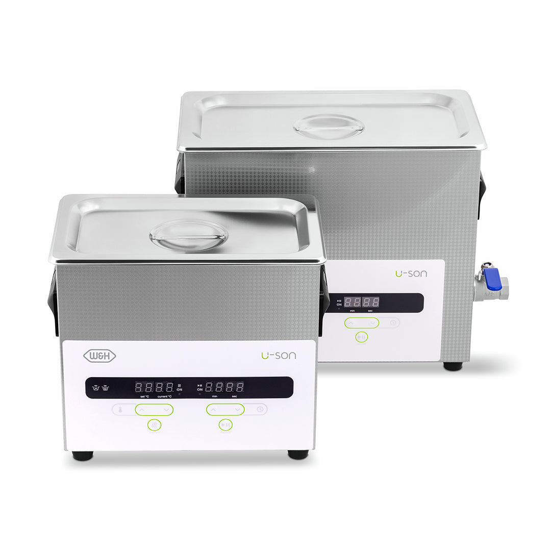The use of ultrasound is recognized as a safe and efficient way to clean dental instruments ensuring many advantages over ordinary manual cleaning methods. The U-Son ensures: Safe cleaning procedures for the operator Consistently high levels of effective cleaning Time savings Improved cleaning especially for small instruments and those with difficult reach parts ie hinges Removal of stubborn deposits on instruments The W&H ultrasonic range features The U-Son portfolio has been developed to meet the needs of our customer’s, providing a choice of 3 or 6 litre version. Features: Easy to use digital control panel Cycle time settings up to 20 minutes Temperature settings up to 40°, or the option to use without heating Each ultrasonic device comes with the following accessories: Stainless steel lid Stainless steel main basket Mains cable Integrated stainless-steel tap with drain hose – 6 litre version only Current warranty conditions will be applied: 1 year